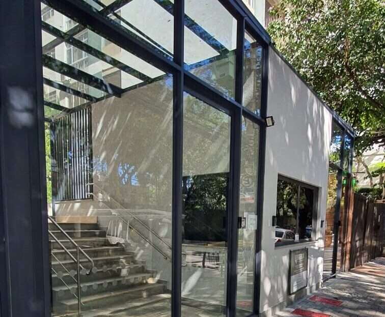 Fachada comercial, portas automáticas por aproximação
